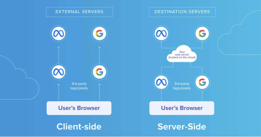 De oplossing: server-side tracking. In het “oude” client-side tracking werd data verzameld via de browser. Met server-side tracking doe je dat vanuit de server. Je zorgt er als het ware voor dat de gegevens direct worden opgeslagen op je eigen server in plaats van dat deze eerst worden opgeslagen op de computer van de gebruiker.