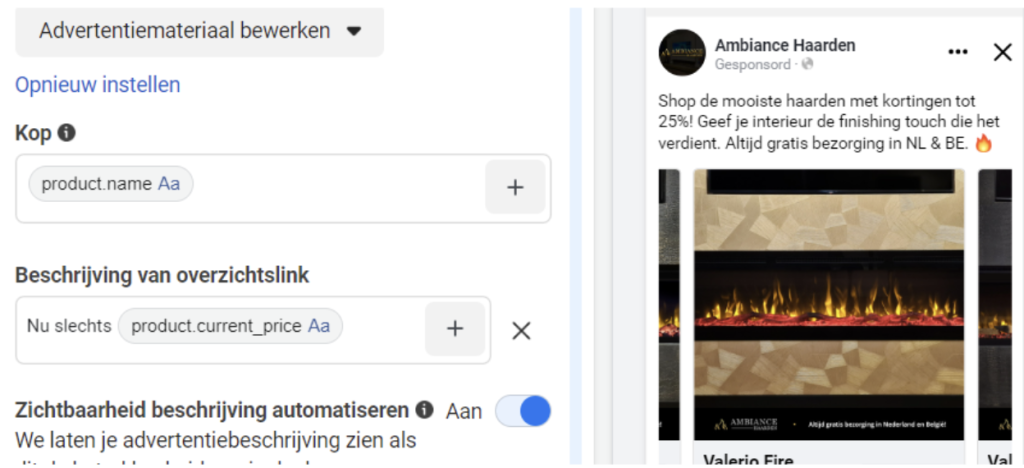 Tijd voor een voorbeeld: de “dynamic catalogus”-campagne. Deze campagnes gebruiken we vaak onderin de funnel, om mensen met persoonlijke advertenties tot aankoop over te laten gaan. We targetten in deze advertentie op gebruikers die al eerder een product hebben bekeken of in hun winkelwagen hebben gedaan. Vervolgens laten we het product waar de gebruiker al enige interactie mee heeft gehad met een “dynamic catalogus” opnieuw aan de desbetreffende persoon zien, zodat de kans groter wordt dat hij of zij tot aankoop over gaat.