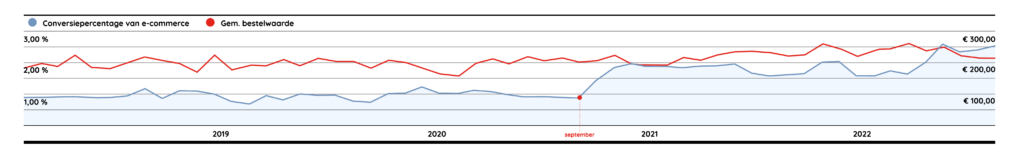 In 2020 zetten we vol in op conversie optimalisatie. Na de livegang van de nieuwe website in oktober dat jaar gaat het ineens héél hard. Samen hebben we het conversiepercentage weten op te krikken naar een gemiddelde van 2%: een stijging van maar liefst 250%.